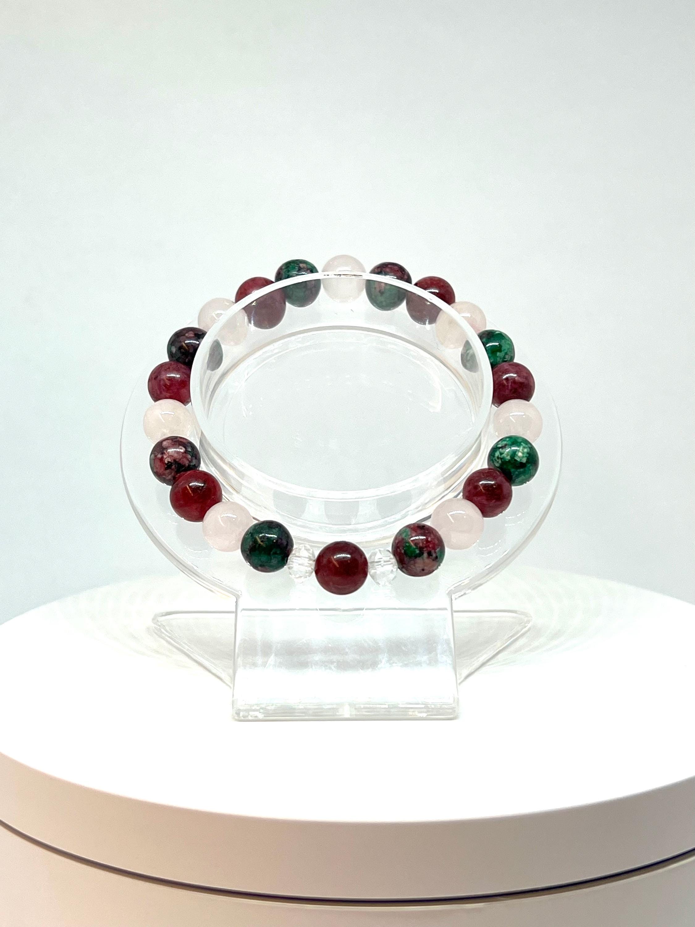 This handmade crystal bracelet combines ruby in zoisite, rose quartz, and garnet. These stones are often associated with love, emotional connection, and inner strength.